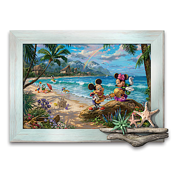 Disney Thomas Kinkade Sunshine Fun Personalized Wall Decor Featuring A Tropical Beach Scene With Vivid Colors & A Dimensional Shelf With The Look Of Driftwood That Adorns The Frame – Close your eyes and imagine yourself relaxing on a tropical beach with the sand beneath your toes and the sun on your back. Now, open your eyes…and suddenly you’re there with some of your favorite friends! Introducing the Disney Thomas Kinkade Sunshine Fun Personalized Wall Decor, available from The Bradford Exchange. This tropical beach wall decor transports you to a seashore setting created by the Painter of Light™, featuring Disney’s beloved Mickey Mouse and Minnie Mouse and friends. This dream-come-true home decor is personalized with any two initials “carved” in a heart on the rock to commemorate a special friendship or relationship.Impressively sized at 16 inches wide, this beach print is artisan recreated to capture all the vivid colors and tones of the original Thomas Kinkade artwork. The stunning vision of beach life features a frame sculpted of artist’s resin, finished with an antique-wash look. A sculpted, dimensional driftwood shelf is attached to the frame displaying an ocean succulent and two starfish so real looking that you’ll want to touch them. This delightful presentation arrives conveniently ready to hang on any wall. Display the tropical beach scene in your home or give it as a stunning personalized gift to loved ones who adore Mickey Mouse and Minnie Mouse. Strong demand is expected for our unique Disney decor, so don’t delay. Order now!This fine home decor is not intended for children.